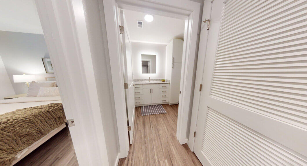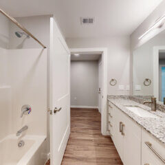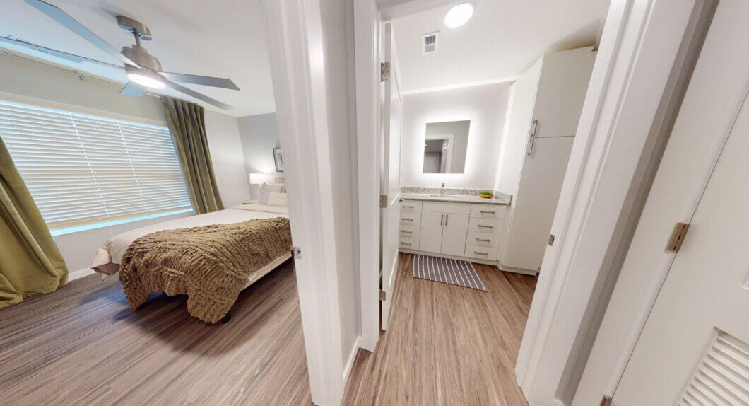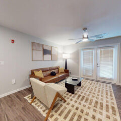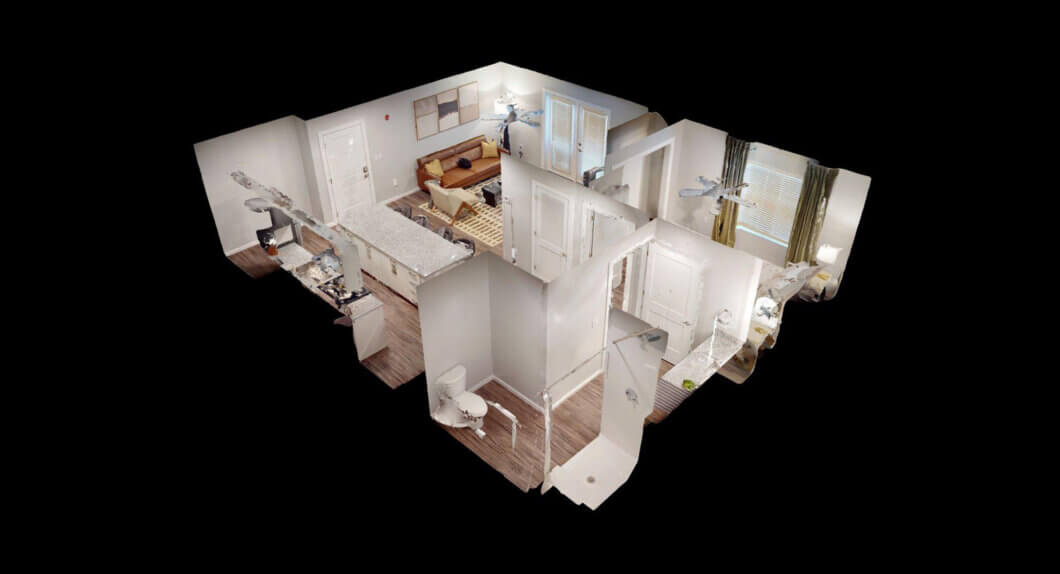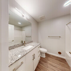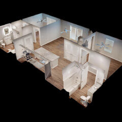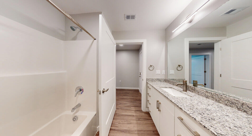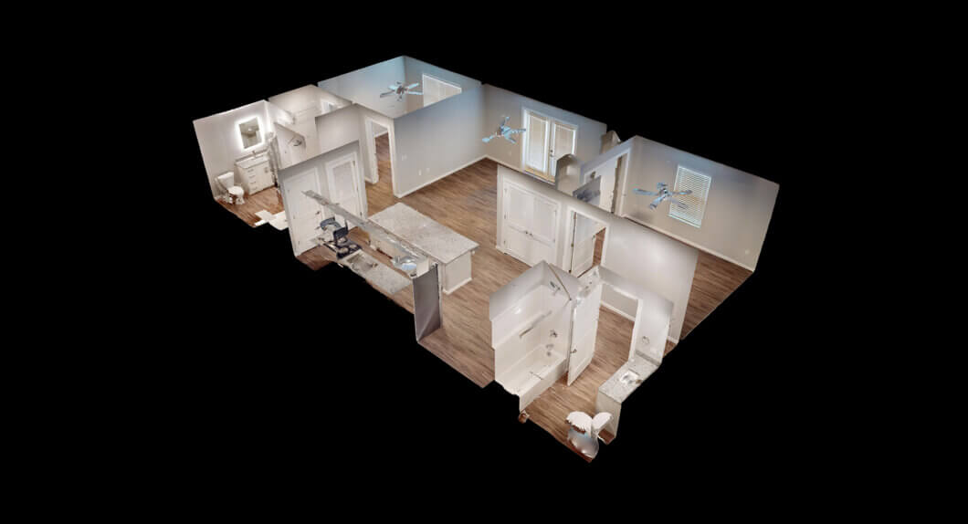 Size: 1083Bedrooms: 2Bathrooms: 2Our two bedroom option is 1083 sq. ft. with two good-sized bedrooms, one with a connecting bathroom and the other with a bathroom steps away. This layout also includes a spacious, open-concept kitchen, dining and living room. It also includes a washer and dryer and private balcony to enjoy some fresh air.